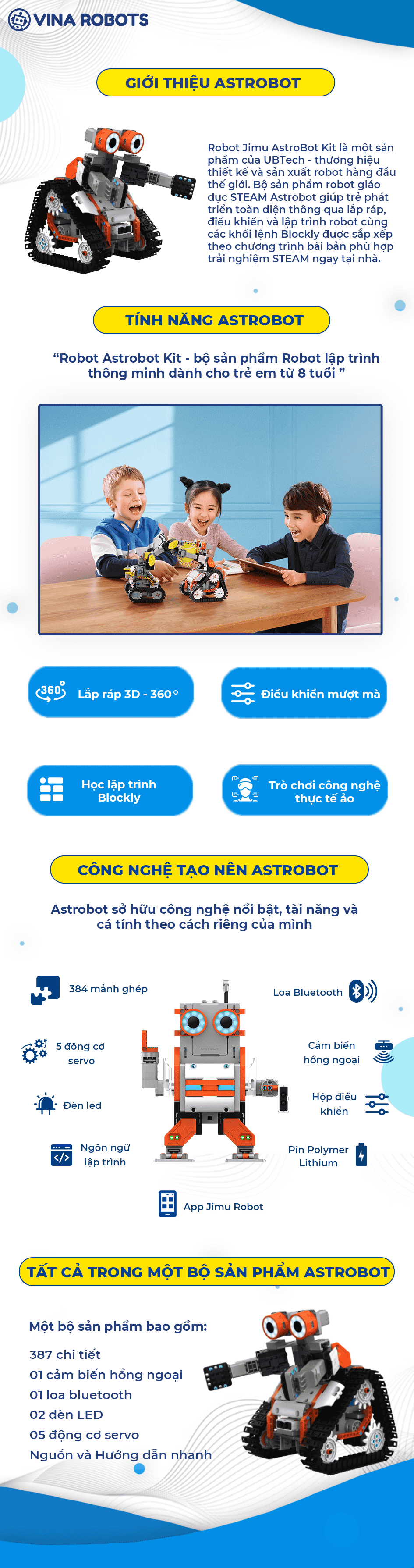 Jimu AstroBot Kit bao gồm mọi thứ trẻ cần để xây dựng ba phiên bản robot chỉ với một bộ Astrobot. Hệ thống khối xây dựng, tương tác này giúp sự sáng tạo phát triển. Bộ AstroBot có bao gồm đủ mọi chi tiết cần thiết để tạo ra AstroBot, Rover, Astron hoặc thậm chí là tác phẩm của riêng bạn. Lập trình và mã hóa các robot này để khám phá, di chuyển và hơn thế nữa với năm servo robot mượt mà, hai mắt LED, loa Bluetooth và cảm biến hồng ngoại.